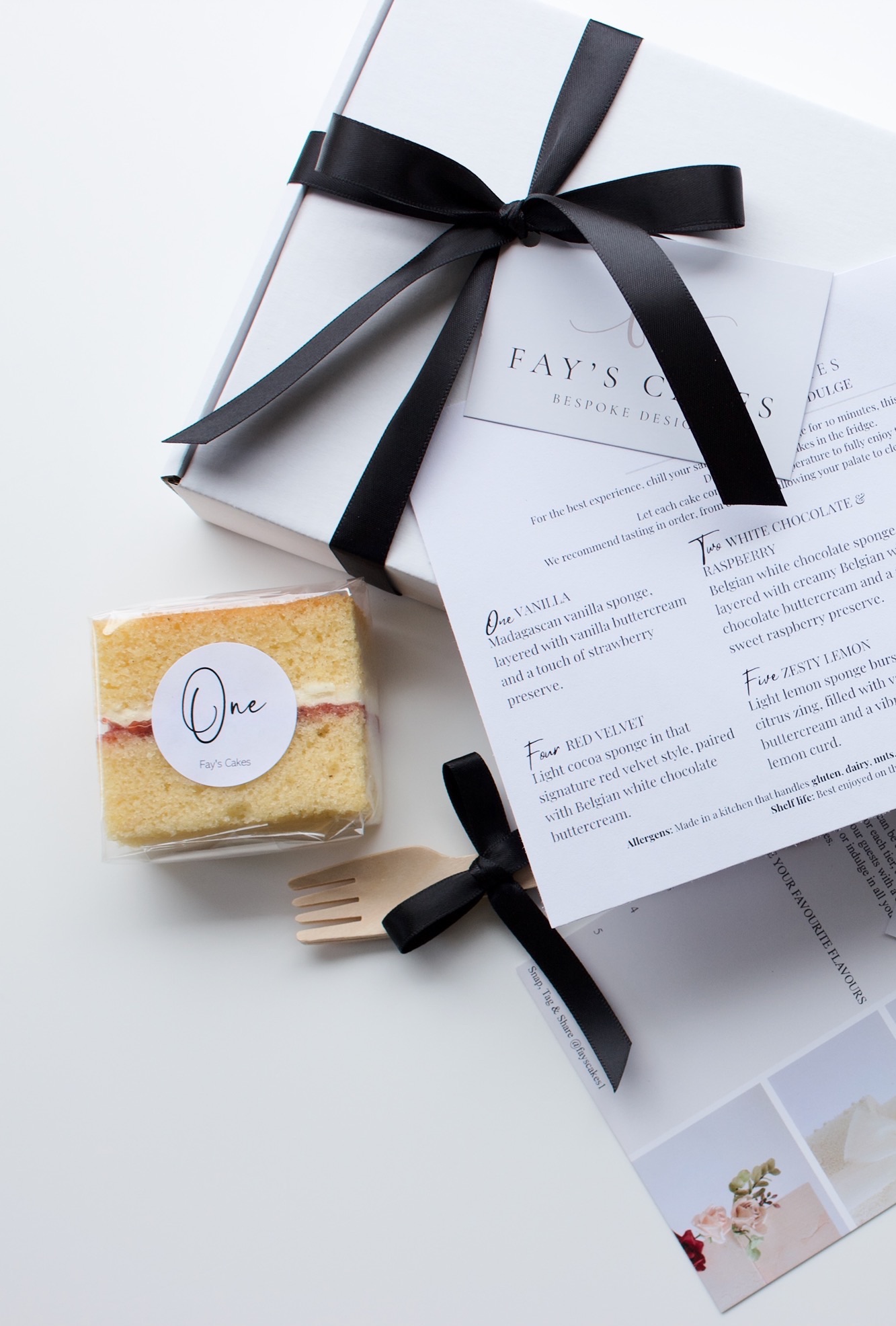 Six of Fay’s most popular wedding cake flavours, freshly baked from scratch and individually hand-wrapped for perfect freshness.