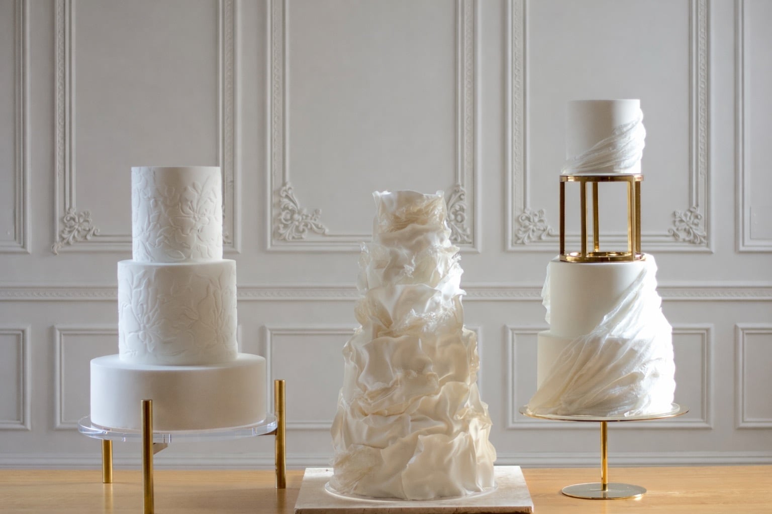 The guide below reflects the most popular wedding cake sizes and design styles from simple, elegant finishes to more detailed statement cakes.
